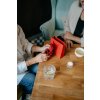 Dárkové balení obsahující červenou dárkovou krabičku a dárkovou tašku se zlatým logem.