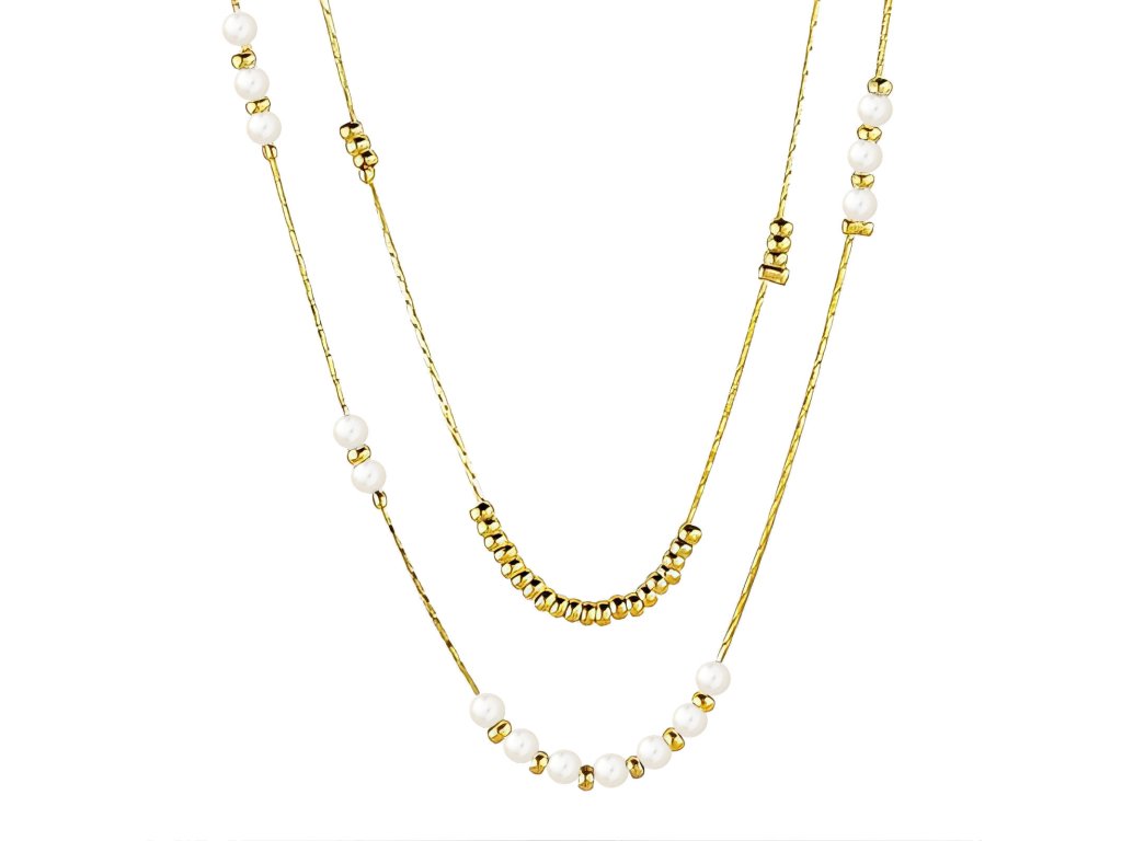 - Náhrdelník je zdoben syntetickými perličkami a malými pozlacenými korálky.