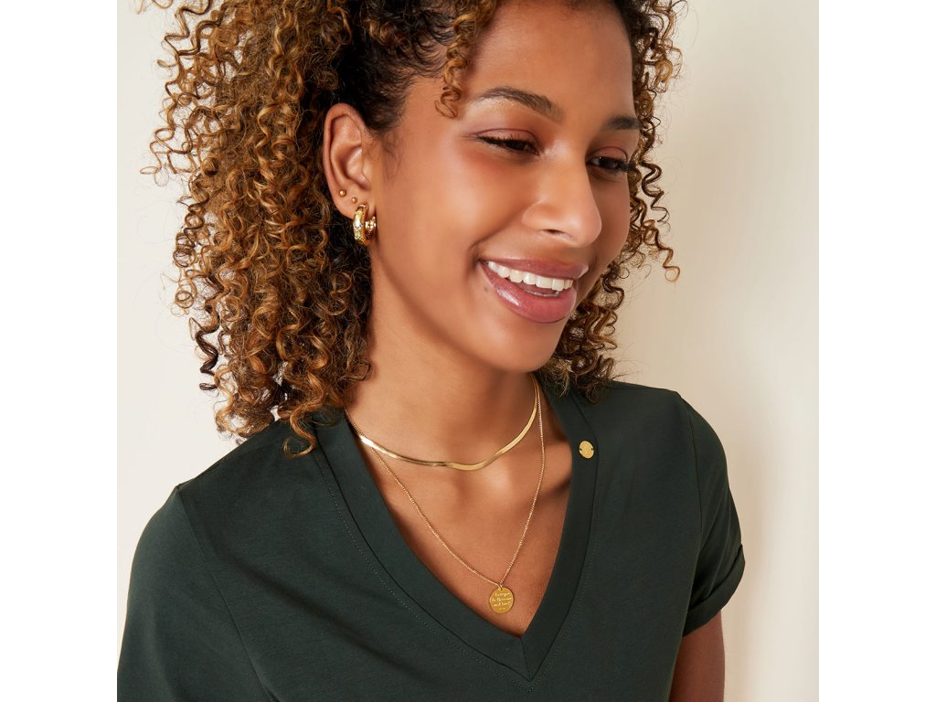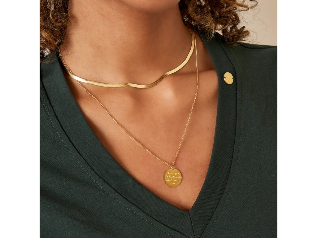 Dvojitý náhrdelník z pozlacené chirurgické oceli, jeden řetízek s medailonkem s nápisem LOVE YOU TO THE MOON AND BACK a druhý plochý řetízek typu had.
