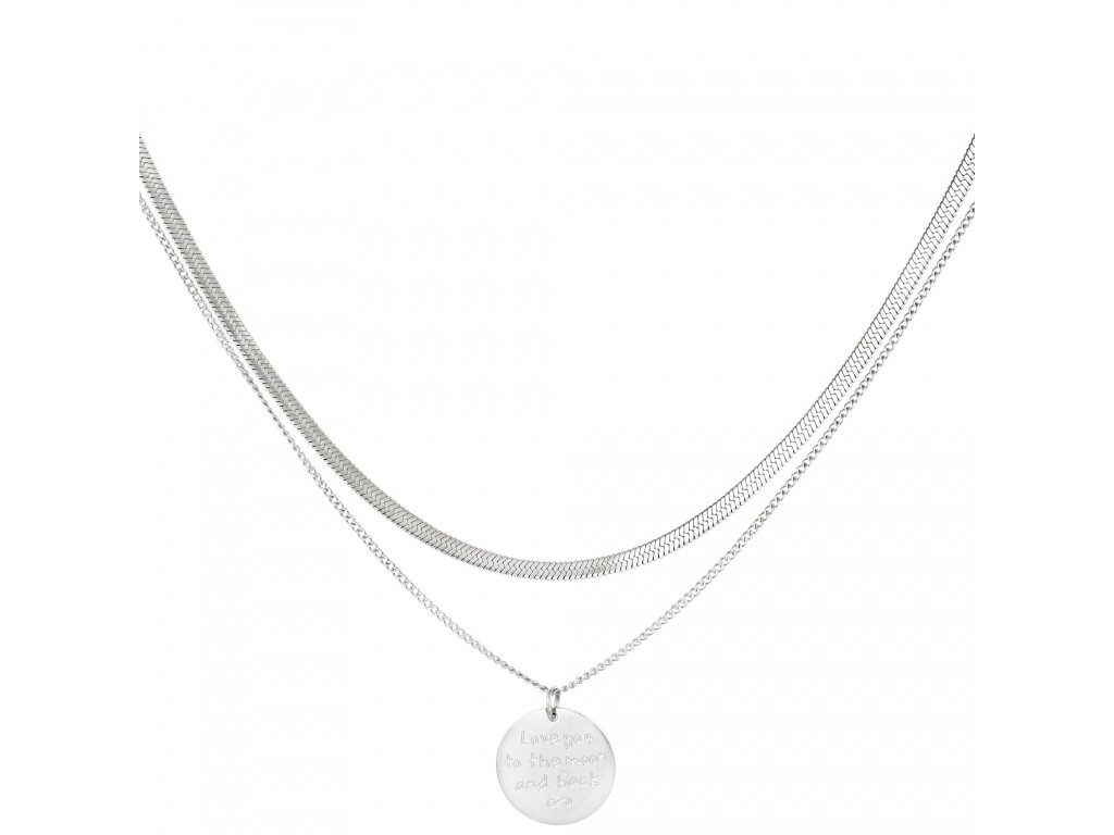 Dvojitý náhrdelník z chirurgické oceli, jeden řetízek s medailonkem s nápisem LOVE YOU TO THE MOON AND BACK a druhý plochý řetízek typu had.