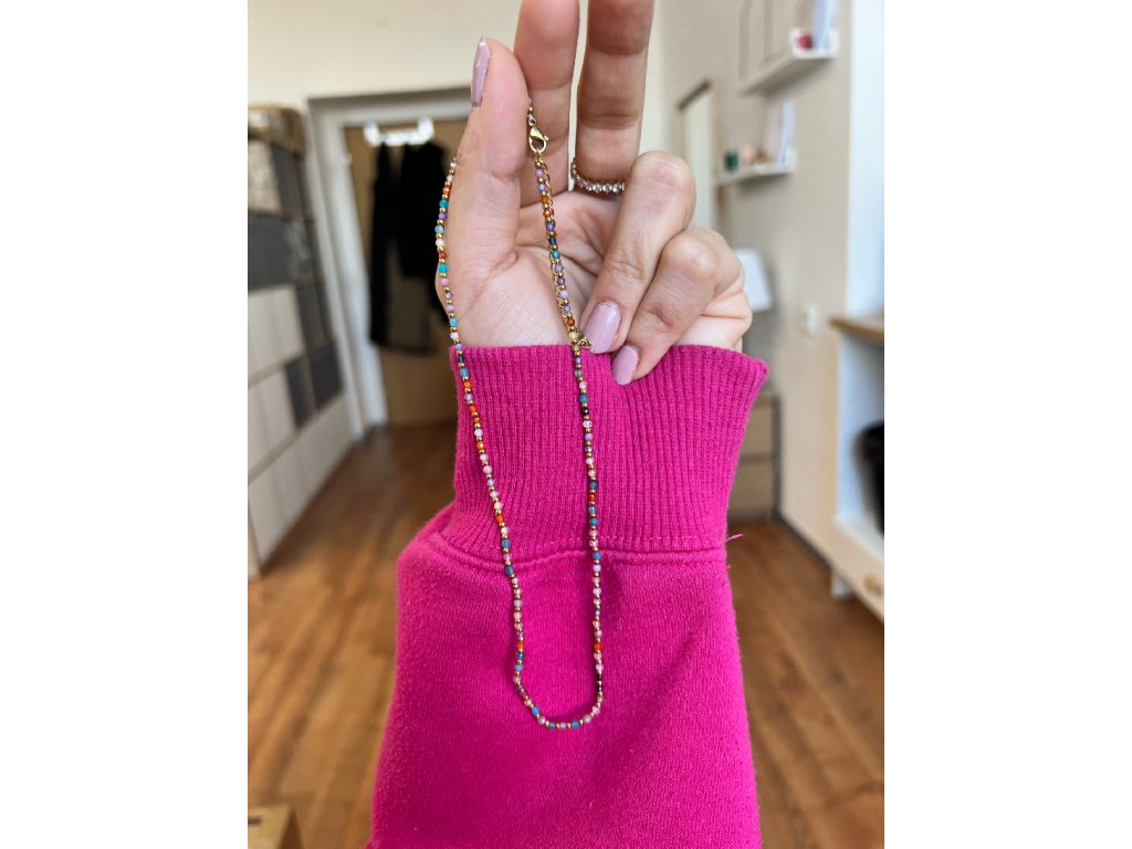 Krásný barevný letní náhrdelník z barevných drobných kamínků a z pozlacené chirurgické oceli.