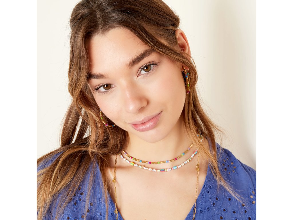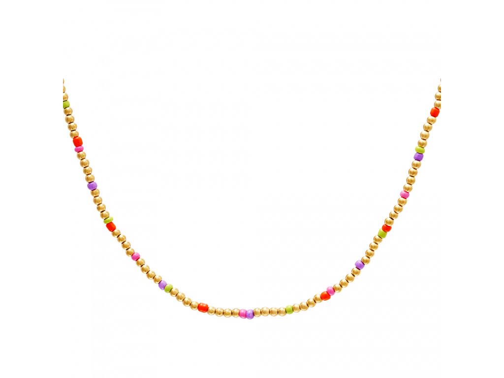 Náhrdelník z barevných korálků a perliček z pozlacené chirurgické oceli.
