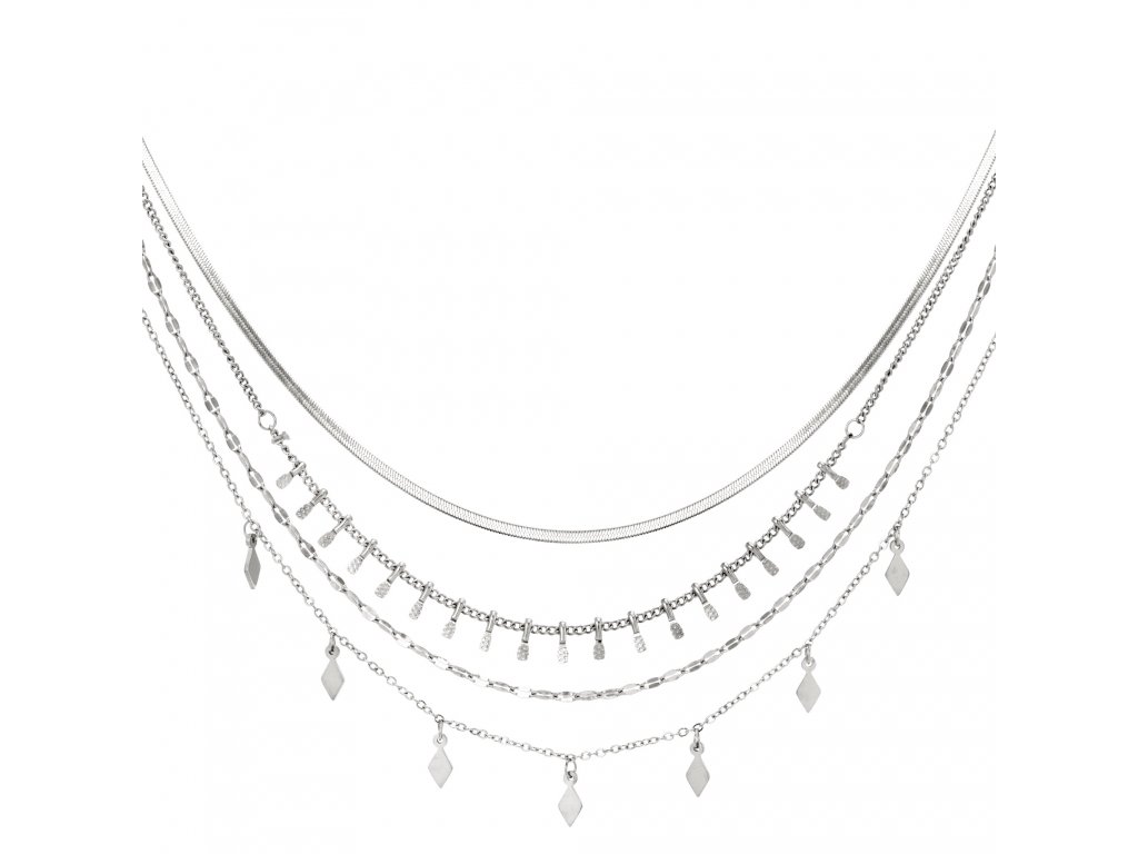 Náhrdelník z chirurgické oceli se čtyřmi různými řetízky.