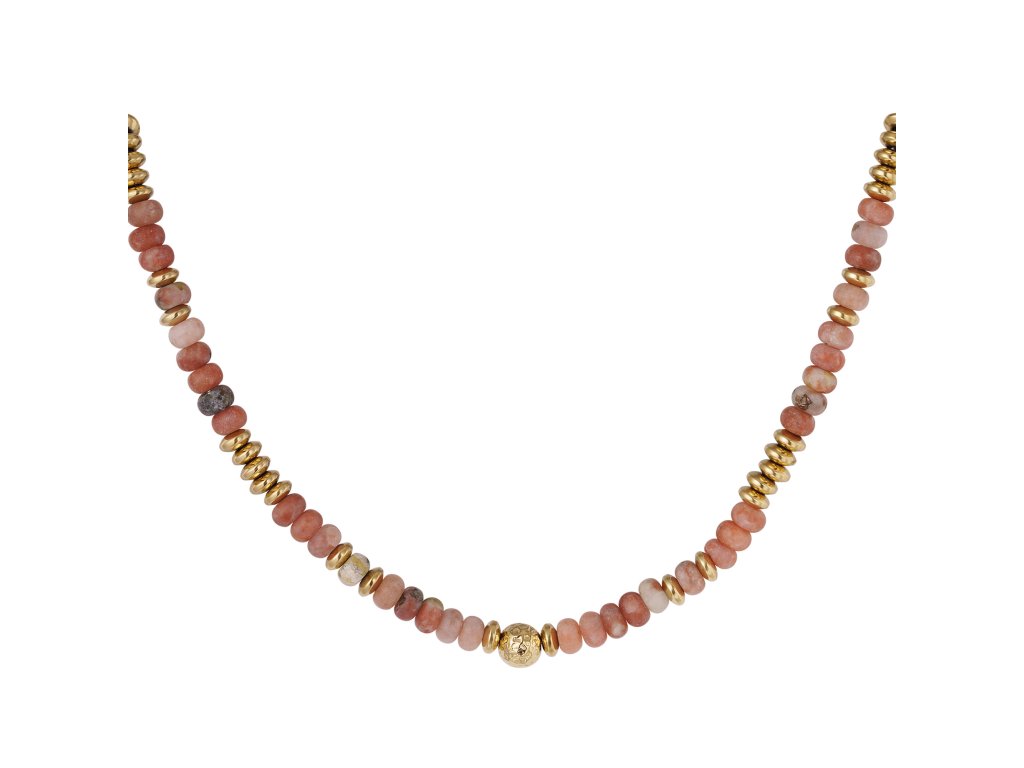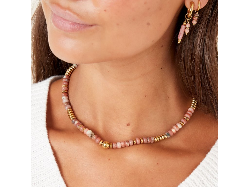 Nádherný, výrazný náhrdelník z přírodních kamenů a pozlacené chirurgické oceli. Kameny jsou laděny do odstínu růžové a jsou doplněné zlatými korálky.
