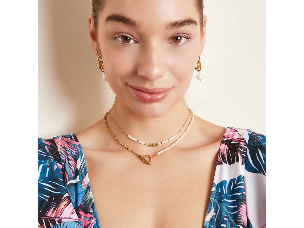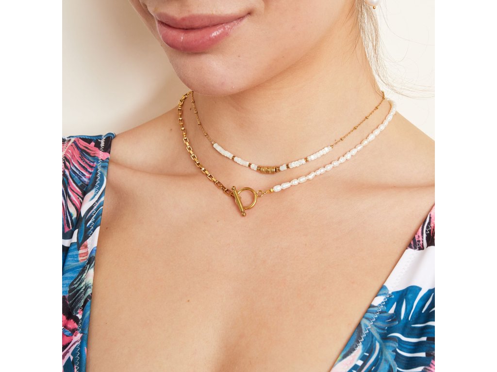 Náhrdelník z pozlacené chirurgické oceli a sladkovodních perel.