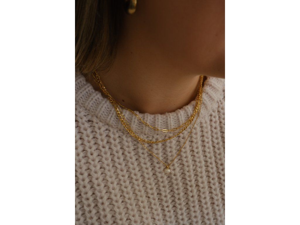 - Nepřehlédnutelný trojitý náhrdelník je zdoben přívěskem syntetické perly.