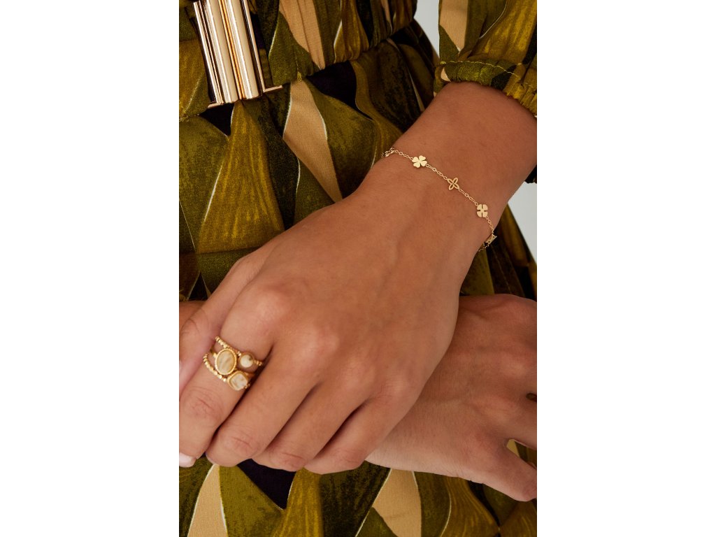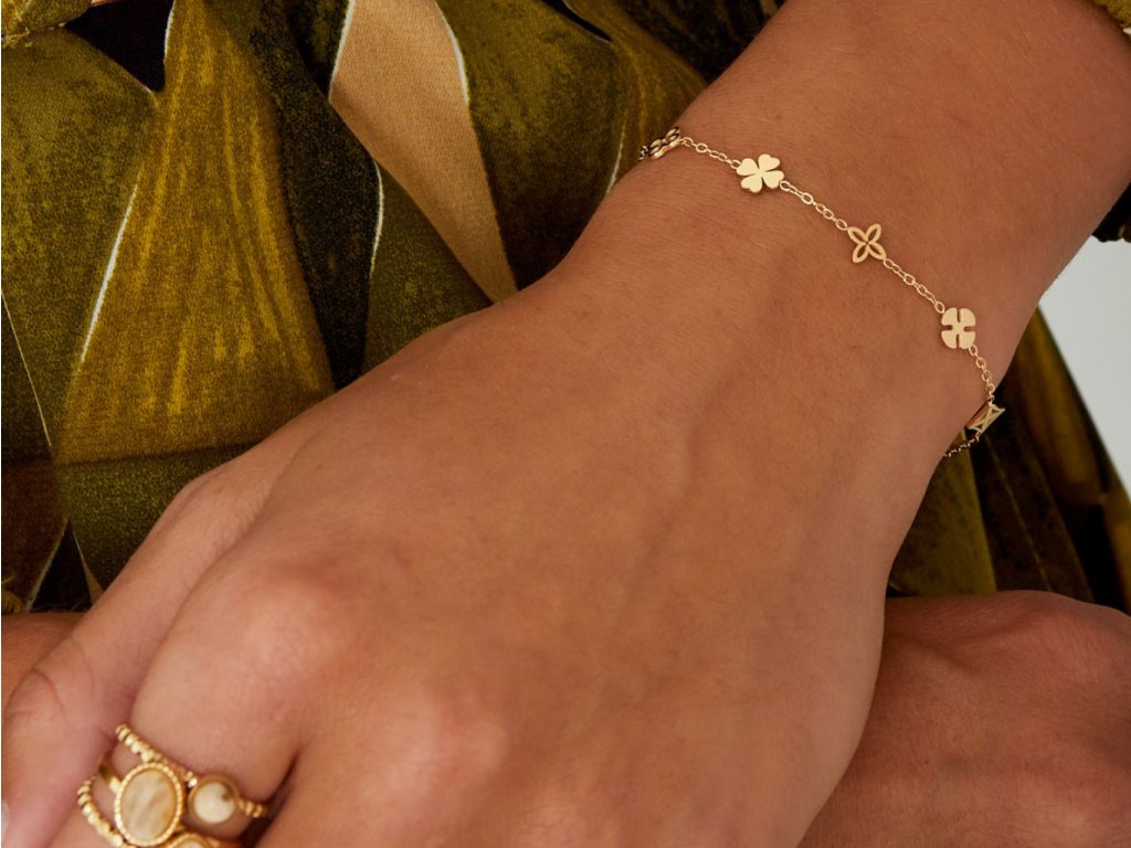 Stylový pozlacený náramek LUCKY, který krásně ozdobí tvé zápěstí. Tento šperk z pozlacené chirurgické oceli je zdobený jemnými přívěsky ve tvaru čtyřlístku a geometrických motivů. Náramek tak symbolizuje štěstí, harmonii a eleganci. Ideální doplněk pro každodenní nošení i speciální příležitosti.