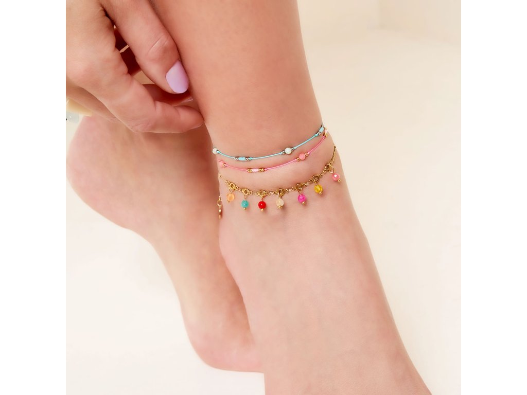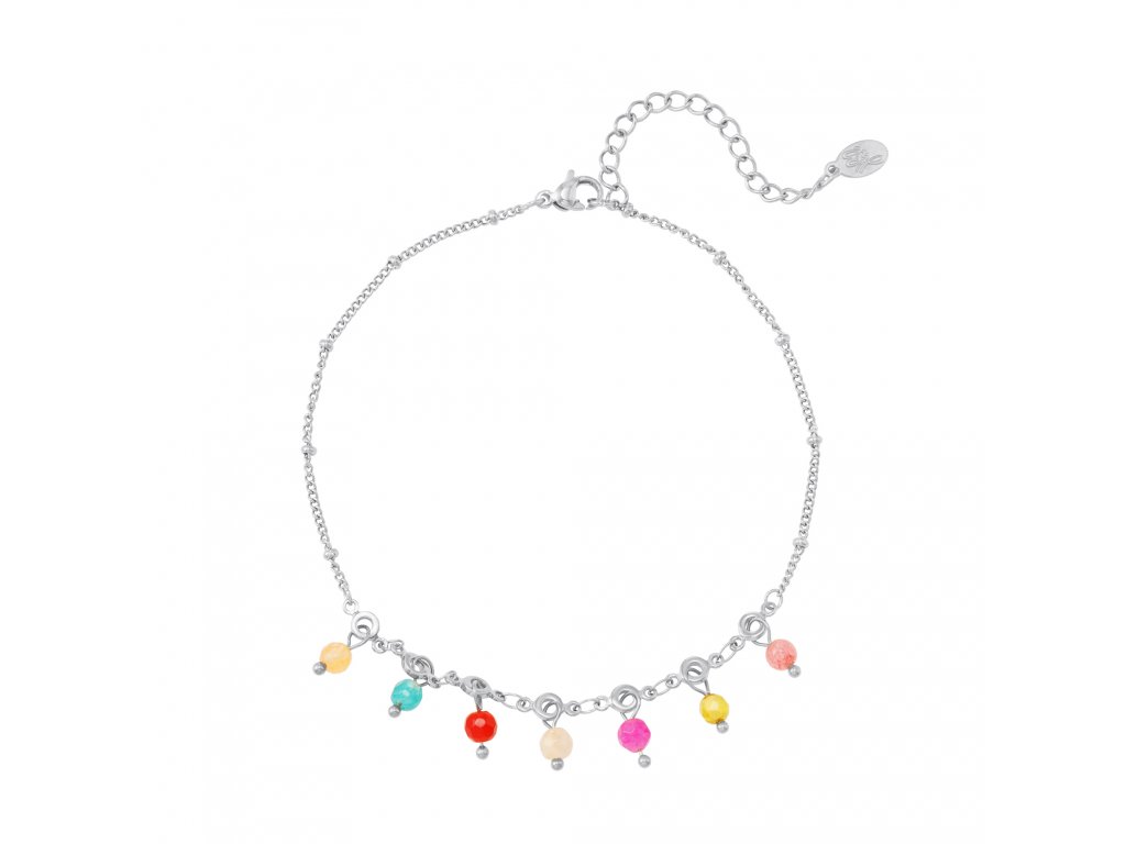 Nádherný letní řetízkový náramek na nohu z kuliček z chirurgické oceli a barevných kamínků.