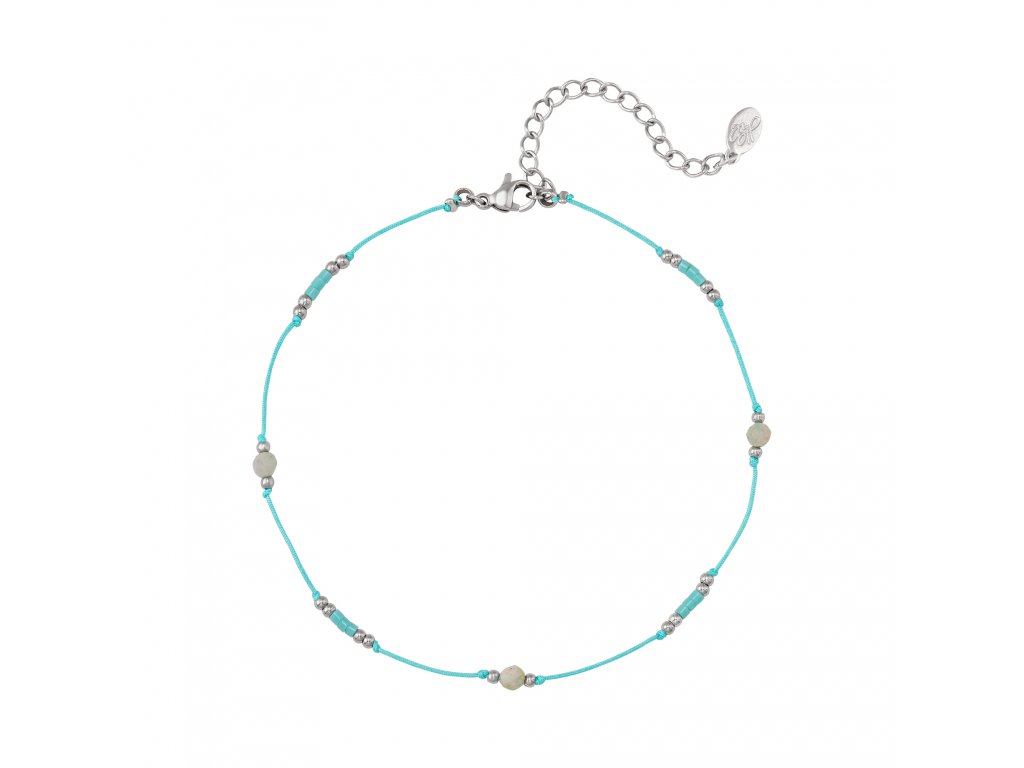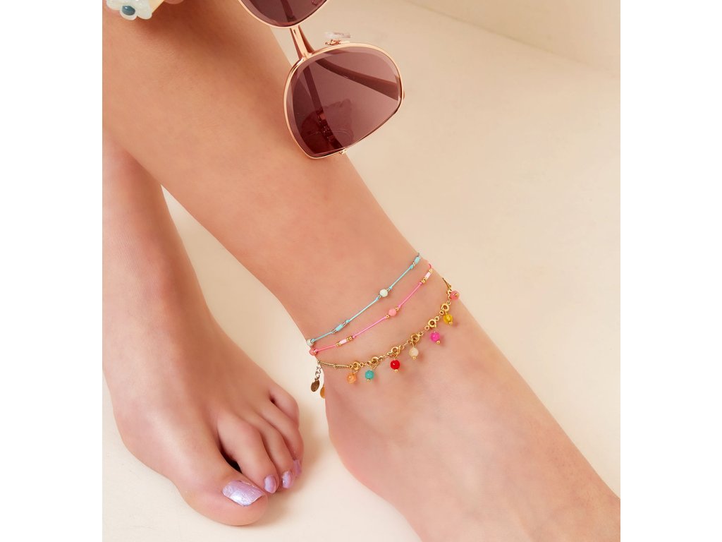 Letní šňůrkový náramek na nohu ozdobený barevnými kamínky a kuličkami z chirurgické oceli.