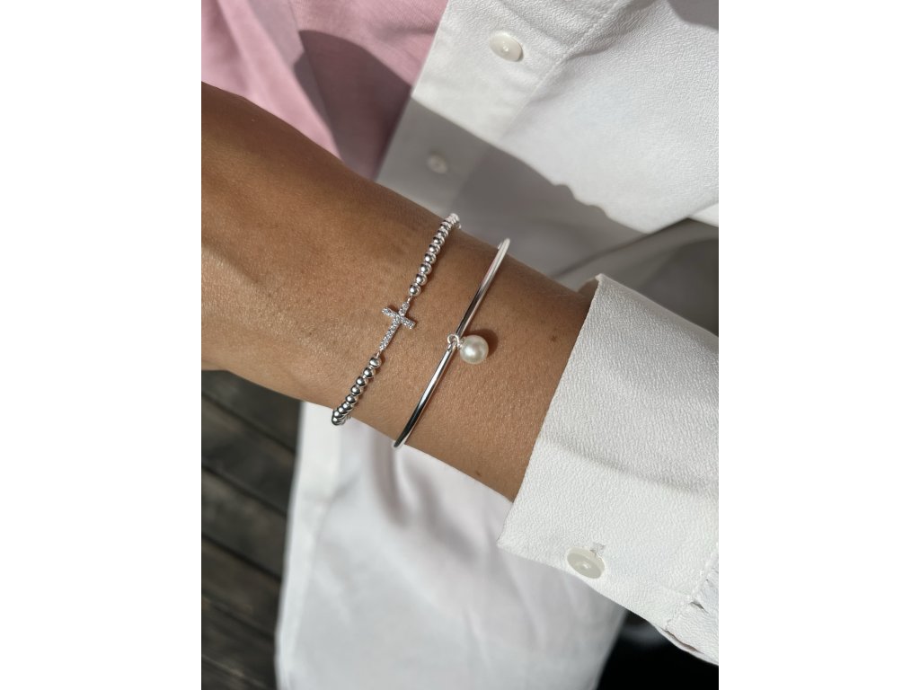 - Stříbrný pružný náramek Ball ze stříbrných korálků a křížkem, který je ozdobený kamínky kubického Zirkonu.