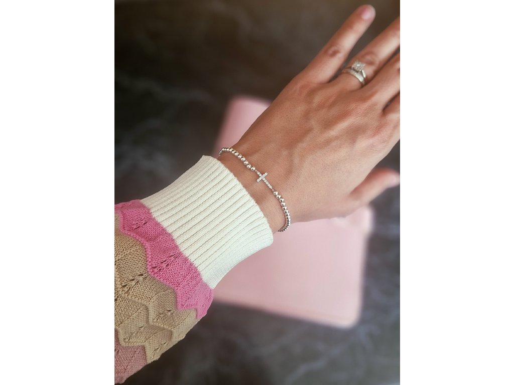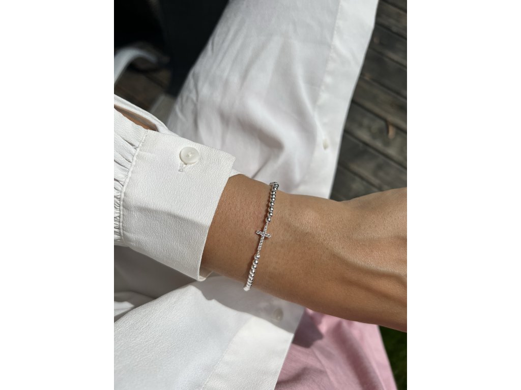 Stříbrný pružný náramek Ball ze stříbrných korálků 3mm a krásným křížkem, který je ozdobený kamínky kubického Zirkonu.
