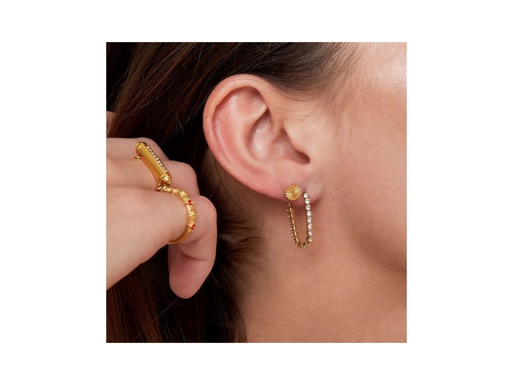Náušnice z pozlacené chirurgické oceli se zavěšeným řetízkem s čirými krystaly.