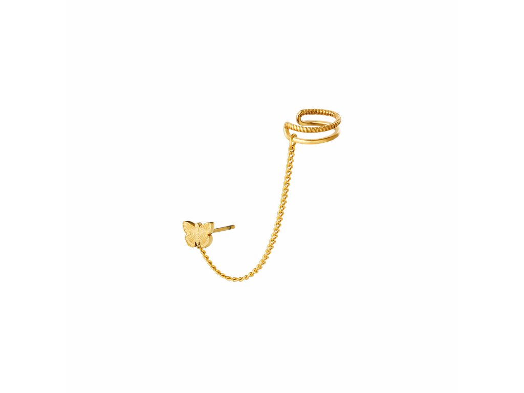 Single náušnice BUTERFLY z pozlacené chirurgické oceli ve tvaru motýlka s ozdobnou záušnicí, která je spojená řetízkem.