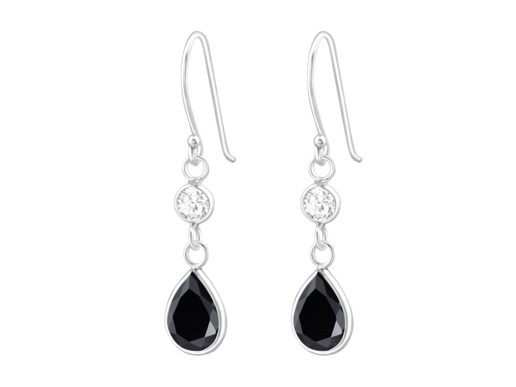 Stříbrné visací náušničky ve tvaru kapky s čirým a černým kubickým Zirkonem.