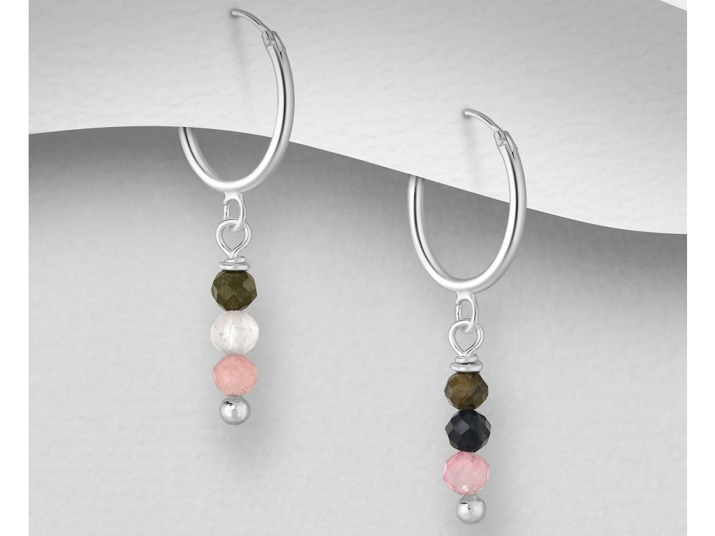 Decentní stříbrné náušnice kroužky AURI s přívěskem, který je zdobený barevnými kamínky Turmalínu.
