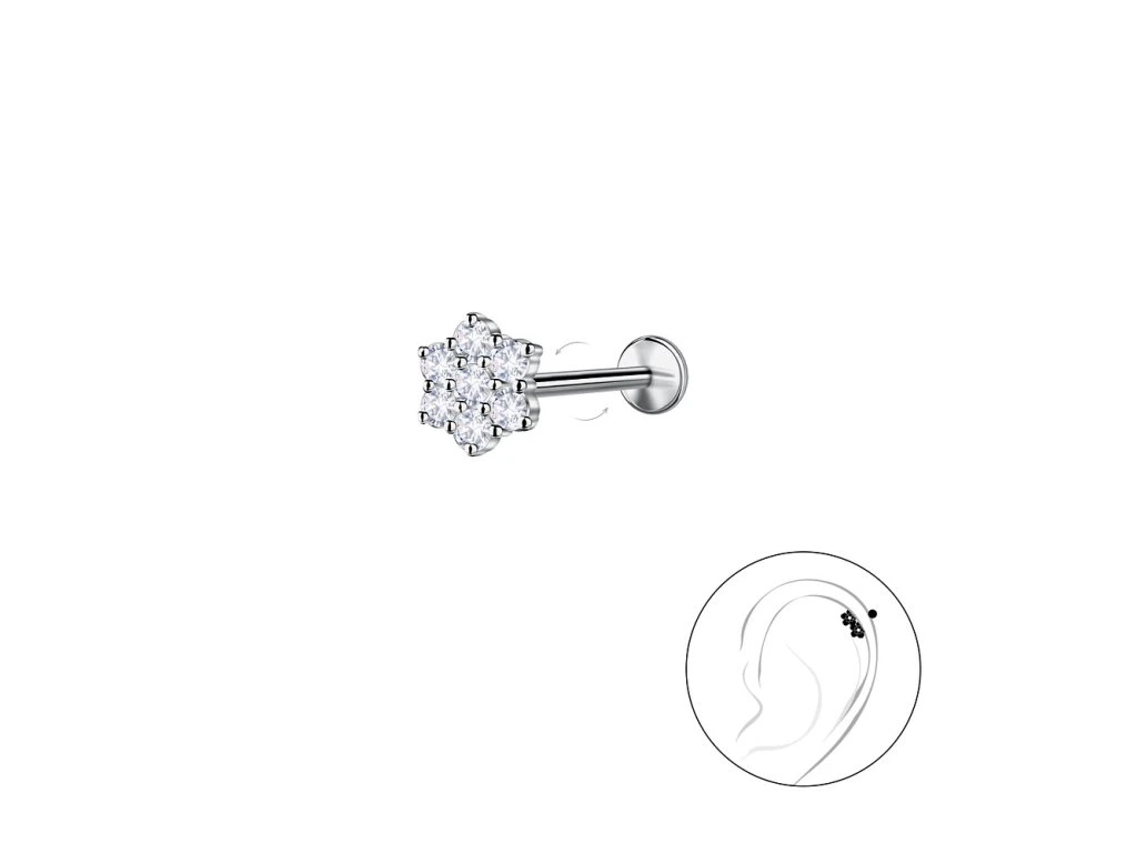 - Půvabný, stříbrný piercing/náušnice do ucha FLOWER je osázený krásnými kubickými Zirkony.