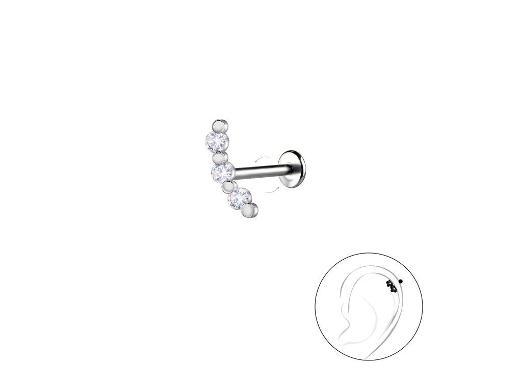 - Tento piercing typu labreta má plochou destičku na jedné straně a závitovou tyčinku na druhé, což umožňuje pohodlné a bezproblémové nošení šperku.