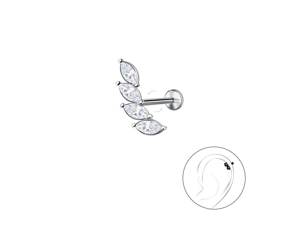 - Tento piercing typu labreta má plochou destičku na jedné straně a závitovou tyčinku na druhé, což umožňuje pohodlné a bezproblémové nošení šperku.