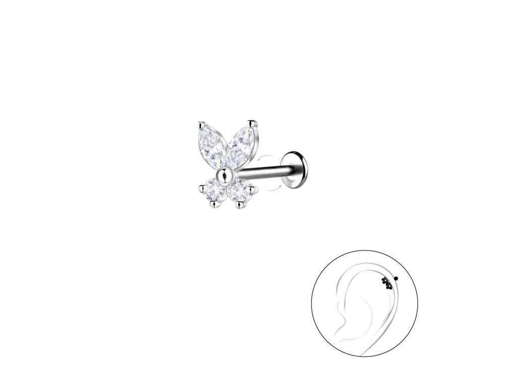 - Třpytivý, stříbrný piercing/náušnice do ucha BUTTERFLY je osázený krásnými kubickými Zirkony.