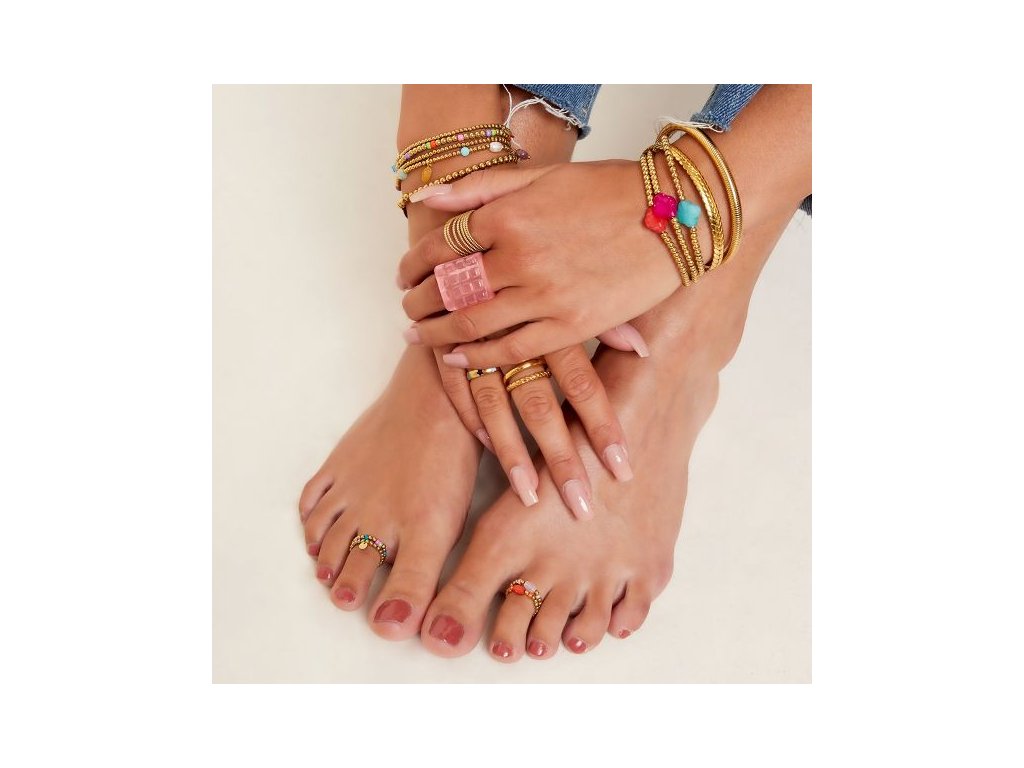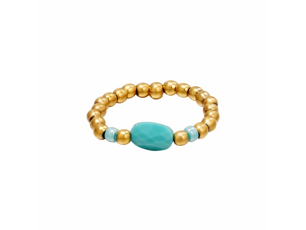 Prsten s jedním velkým barevným kamenem uprostřed a dvěma malými korálky stejné barvy. Zbytek prstýnku zdobí drobné zlaté korálky z Hematitu. Nezbytný doplněk na léto :-)