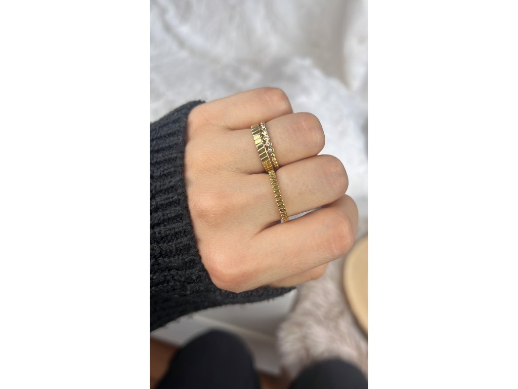 Luxusní dvojitý prsten ADRI, který si zamiluješ. Jeden kroužek je osázena kubickými Zirkony a druhý je vroubkovaný. Prsten je pozlacený 14k zlatem a můžeš jej nosit samostatně nebo s dalšími prsteny.