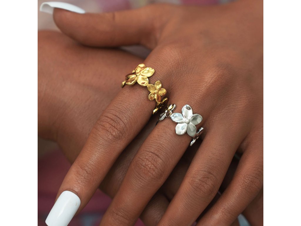 - Výrazný prsten s motivem květin na ruce krásně vynikne.