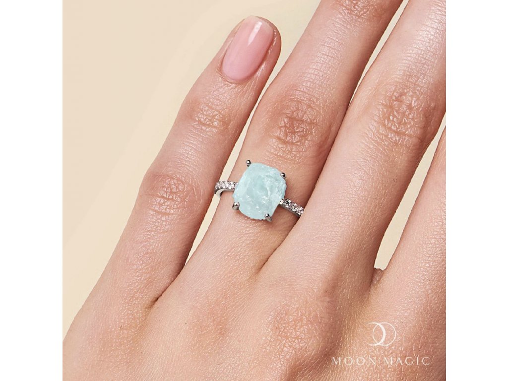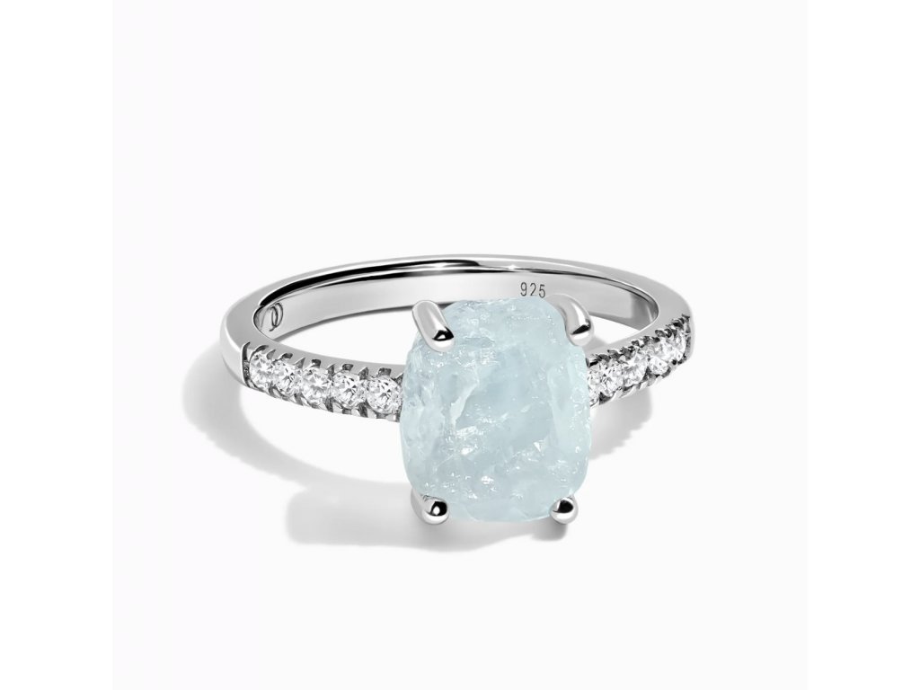 - Prsten upoutá pozornost nedokonale dokonalým surovým kamenem ledově modrého Akvamarínu.