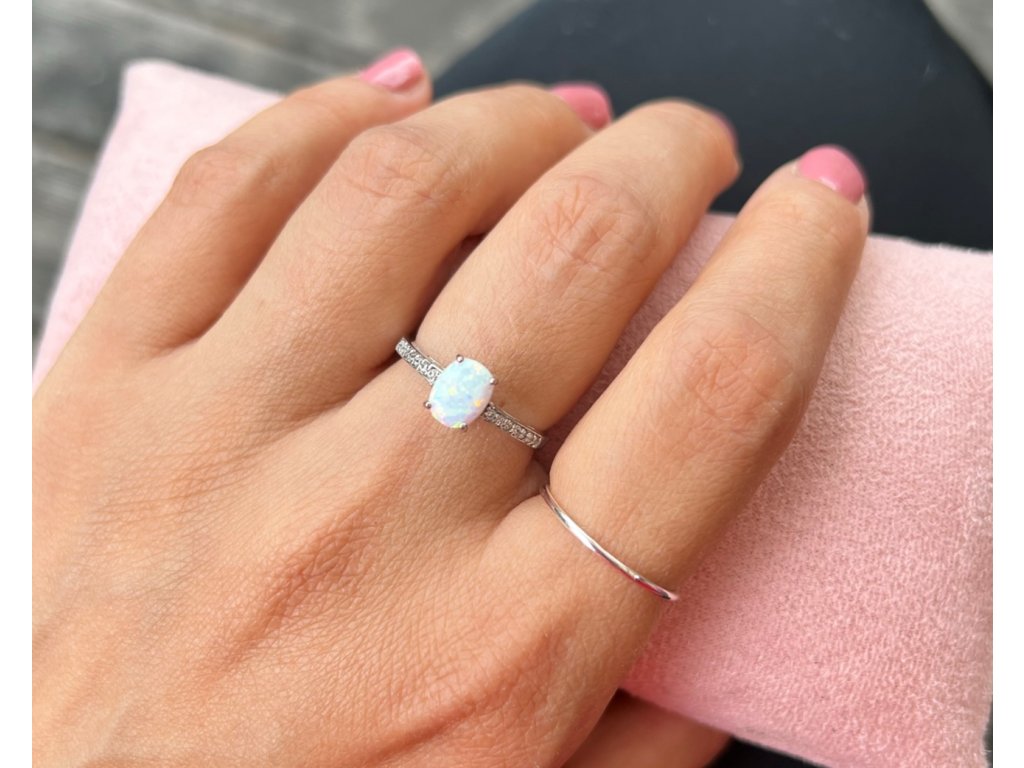 - Nech se okouzlit tímto krásným stříbrným prstenem, který je zdobený syntetickým Opálem a třpytivými kubickými Zirkony po stranách.