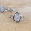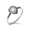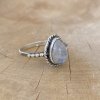 Stříbrný Boho prstýnek s kamenem duhového Měsíčního kamene ve tvaru kapky. Lůžko prstýnku s kamenem je doplněno čtyřmi malými stříbrnými, oxidovanými kuličkami po obou jeho stranách, které dodávají prstýnku antický vzhled.