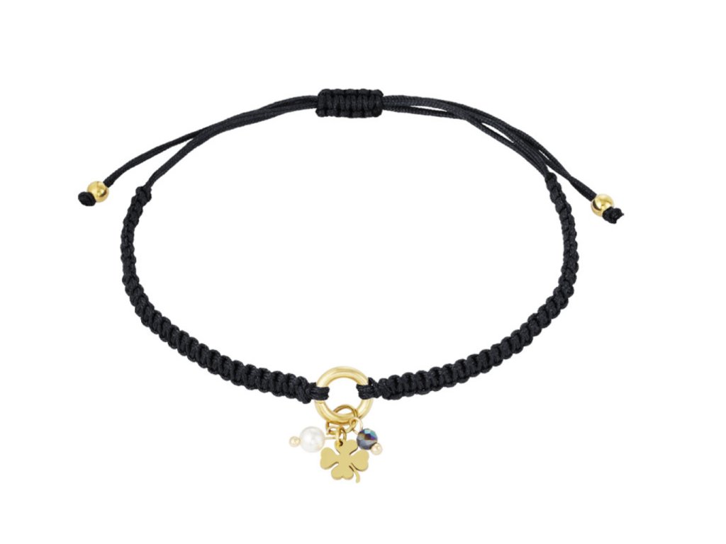 - Krásný pletený náramek FELICITY je zdoben pozlaceným kroužkem s přívěskem perličky, čtyřlístku a skleněného korálku.