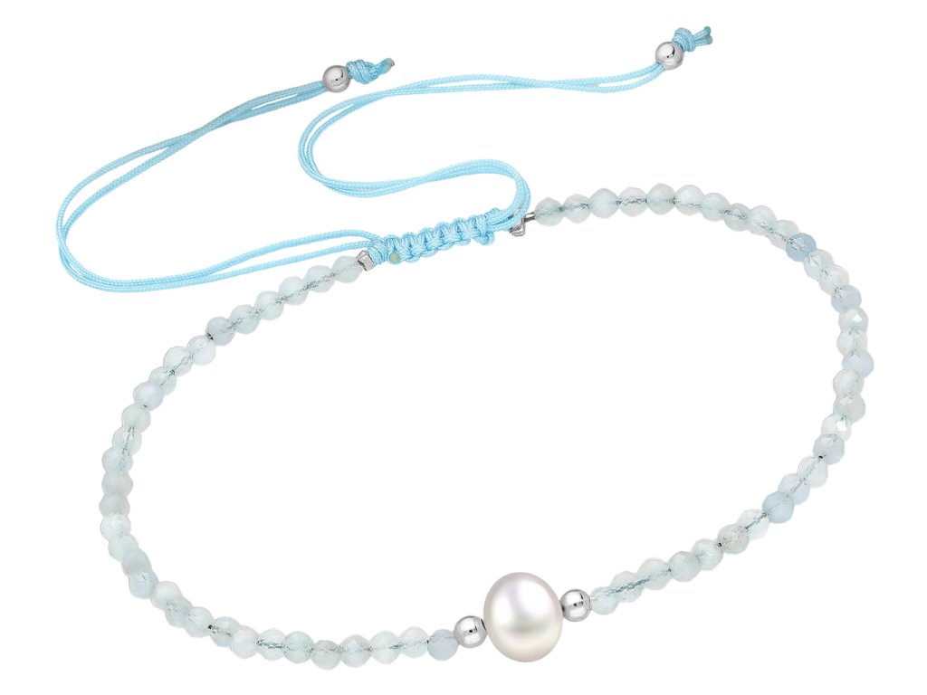 Šňůrkový náramek Akvamarín s perličkou Ag 925/1000