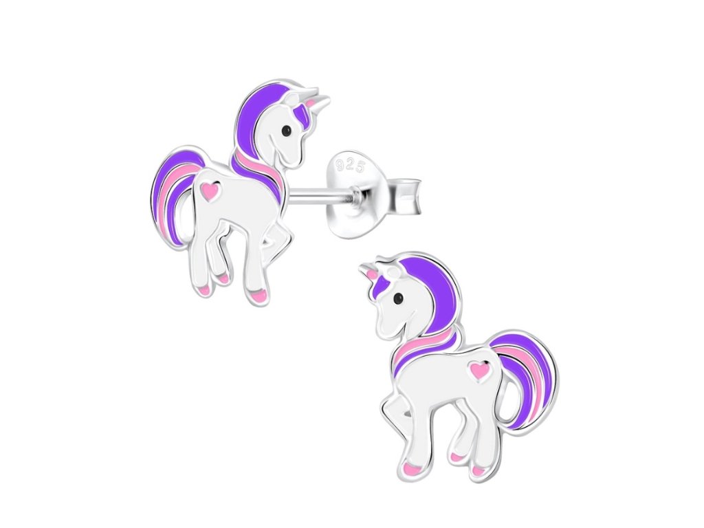 Dětské stříbrné náušnice s barevným jednorožcem se zapínáním na puzetu.