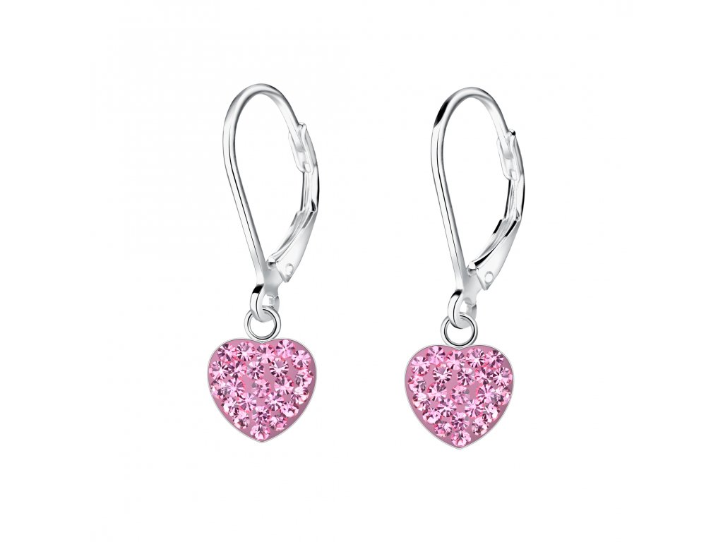 - Krásné dětské stříbrné náušnice se srdíčkem, které jsou osázené třpytivými růžovými krystaly.