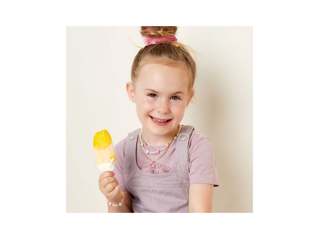 Krásný dětský náramek s barevnými korálky ve tvaru srdíček doplněn přírodními sladkovodními perlami a zlatými korálky z pozlacené chirurgické oceli.