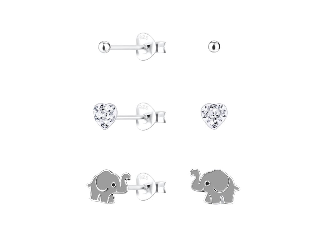 Sada tří dětských stříbrných náušnic se slonem, srdíčkem s krystalem a jednoduchými peckami.