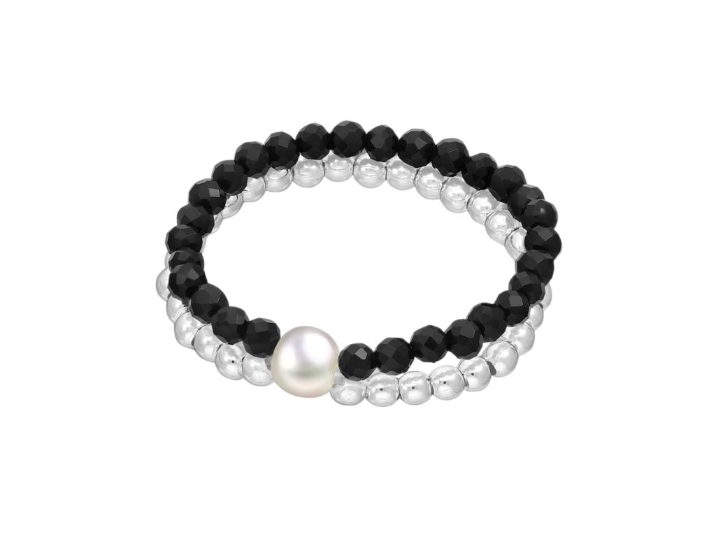 Dvojitý stříbrný korálkový prsten černý Achát s perlou Ag 925/1000